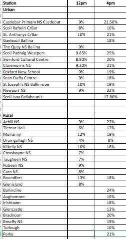Mulranny has the highest turn-out at 12%, while Drumgallagh N.S has the lowest at 4%.