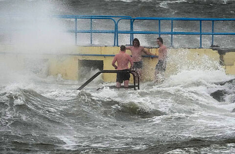 Risks include powerful waves, sudden surges, fast-flowing currents, and rapidly rising water levels.