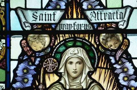 The stained glass window in honour of St Attracta at the church in Kilmactigue.