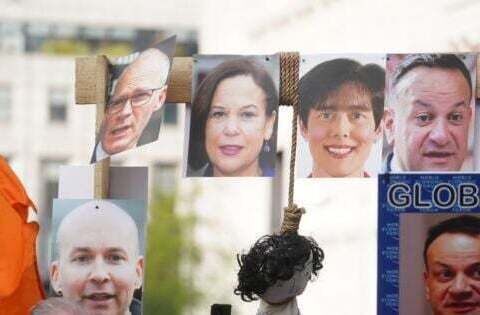 Mock gallows were erected outside Leinster House featuring images of politicians across the political divide, including Taoiseach Leo Varadkar, Sinn Féin leader Mary Lou McDonald and People Before Profit TD Paul Murphy.