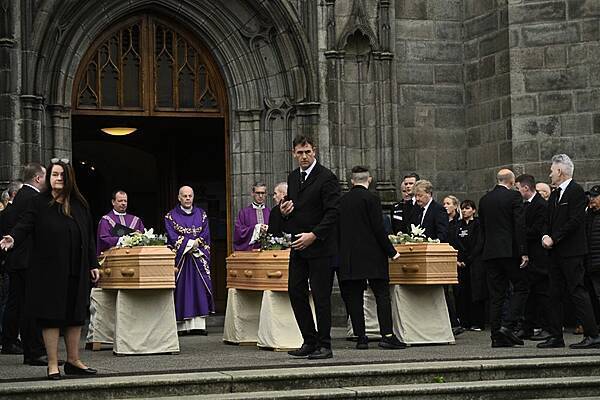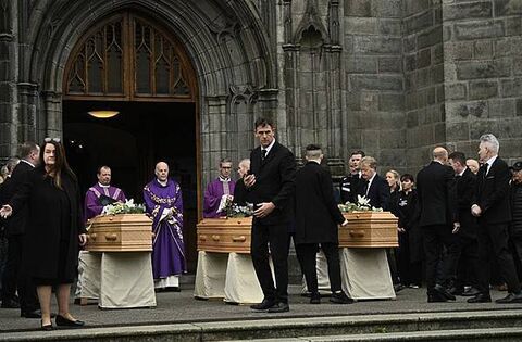 The three wooden coffins were brought to the front of St Patrick’s Church in Dundalk for the funeral mass, where a framed portrait had been placed.