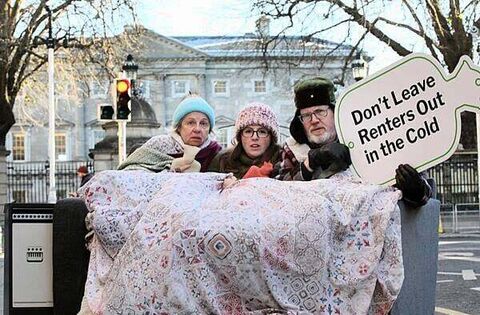 The evocative photostunt took place on Kildare Street on the footpath outside Dáil Éireann on Thursday to highlight the plight of renters, who are paying extortionate rent while being forced to live in sub-standard, under-insulated homes, due to the lack of any basic energy efficiency standards for rented accommodation.