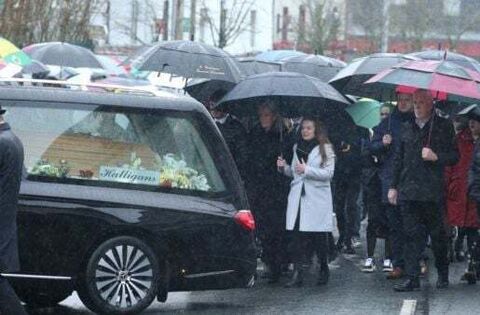 Hundreds of mourners stood in the pouring rain to pay their respects at the funeral of Michael 'Mikey' Kelly on Tuesday.