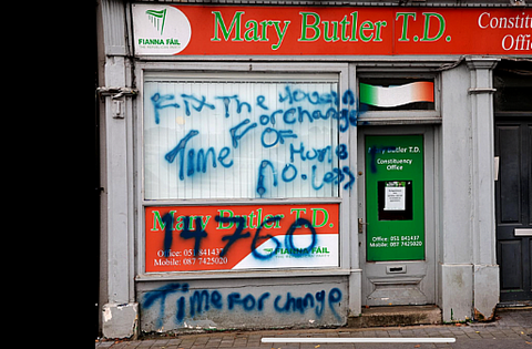 Located on the quay in the city the building was daub with slogans including “Time for change” and “Fix the housing”.