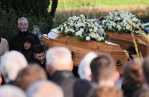 The coffins of father and son Peter and Loughlin Devlin being carried into the Church of St Joseph in Tynan for their funeral. Photo: Niall Carson/PA.