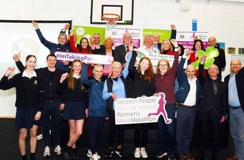 Among those attending last Friday's launch of the 2024 Mayo.ie Western People Women’s Mini-Marathon at St Mary's Secondary School in Ballina were Minister Dara Calleary, Cllr Annie May Reape, Cllr Michael Loftus, Cllr Mark Duffy, Cllr Seamus Weir (Cathaoirleach, Ballina MD), members of Mayo Sports Partnership, St Mary's school principal Robert O'Reilly, Declan Turnbull, Mayo County Council, Aidan McNulty, Western People Commercial Manager, and St Mary's pupils. Pictures: John O'Grady