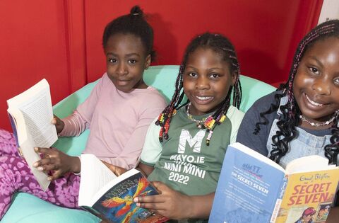 Sisters Fidelma and Faina Salami with their friend Mariam Oladimeji at the launch of Summer Stars 2023 reading initiative at Mayo County Library. Picture: Alison Laredo
