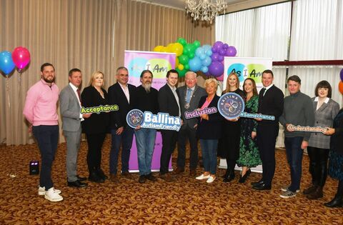 Pictured at the launch of Ballina Autism Friendly Town at the Great National Hotel were, from left: Padraig O'Hora, William Nestor (ASIAM), Amanda McGuinness, Minster of State Dara Calleary TD, Luke Flannagan MEP, Adam Harris (CEO, ASIAM), Cllr John O'Hara (Cathaoirleach, Mayo Co Council), Cllr Annie May Reape, Elisha Beattie (Chairperson), Annette Kenny, Cllr Mark Duffy, Cllr Jarlath Munnelly, Rebecca Connor Wood and Justina Reape. Picture: John O'Grady