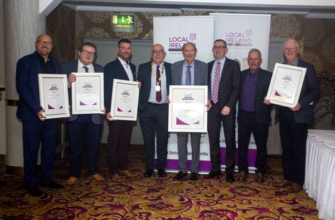 Pictured at the Local Ireland Media awards were Western People staff, from left: Aidan McNulty, Paul O’Malley, Anthony Hennigan, Dan Linehan (President, Local Ireland and Head of The Irish Times Regionals), Terry Reilly (Lifetime Achievement), James Laffey, Declan McGuire (Managing Director, Connacht Tribune) and Fr Brendan Hoban.