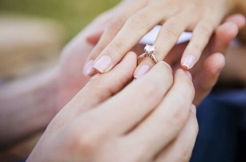 Young man is seen slipping an engagement ring on his girlfriend's ring finger.