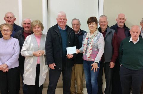 Tomás Solan, on the occasion of his retirement from the RSS Scheme, being presented with a token of appreciation from Mary Brennan and a group of the Ballyglass Community Centre Monday night card players.
