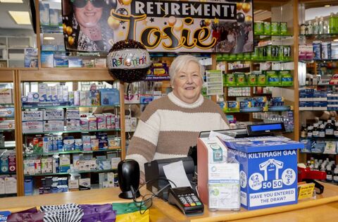 Josie Prendergast behind the counter in Heneghan's Pharmacy in Kiltimagh. Picture: John Corless