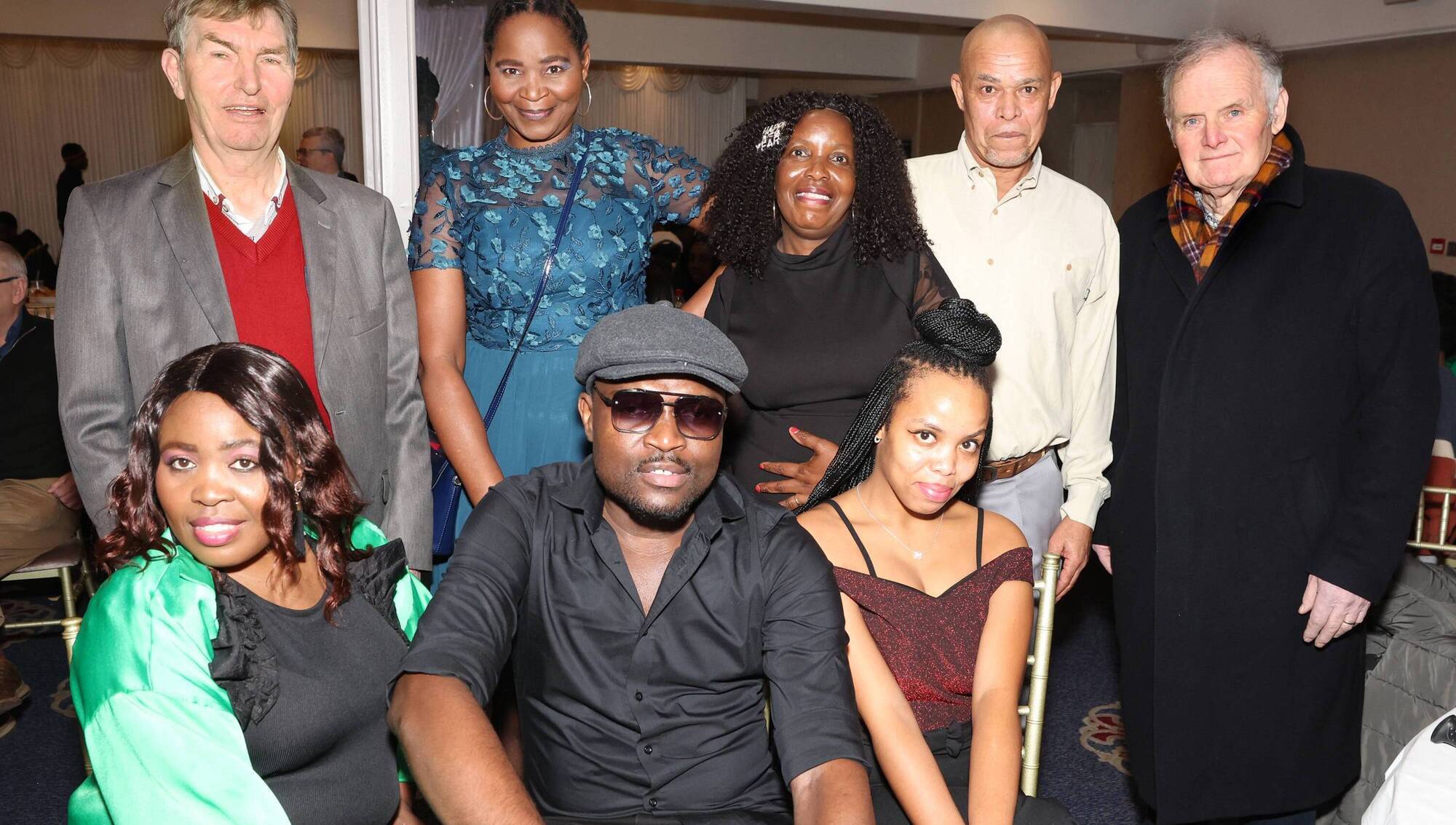 Cllr Al McDonnell and Robert Hennelly with International Protection applicants at the New Year's Party in Breaffy House Hotel.