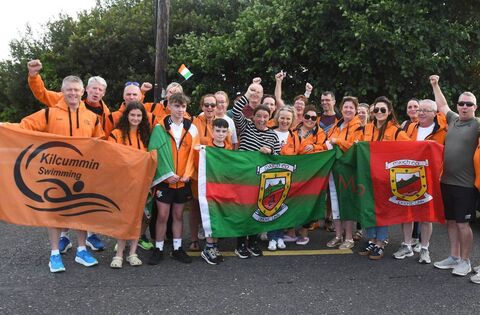 Carol Commons is pictured with members of Kilcummin Swimming Club at her homecoming after completing the North Channel Solo Swim. Pictures: John O'Grady