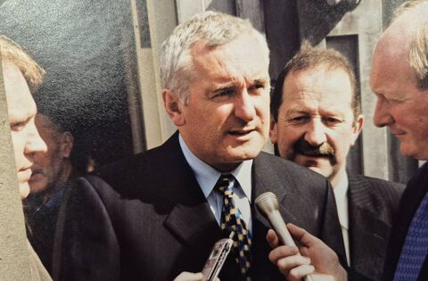 Roving reporter Francis Brennan asks then Taoiseach Bertie Ahern the hard questions during a visit to Mayo. The late TD John Carty is in the background.