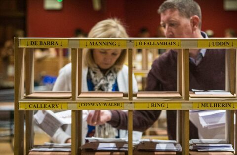 Votes are sorted at the count centre in the TF Royal Hotel in Castlebar during the 2020 General Election. Larger pigeon-holes have had to be sourced due to the size of the ballot paper for the European election. Picture: Keith Heneghan