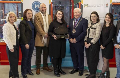 Cathaoirleach of Mayo Co Council, Cllr John O’ Hara, presenting Ce’Nedra Cullen O'Brien with her award, accompanied by members of Oonagh’s family and Mayo Co Council officials, from left: Joanne Grehan, Director of Services, Mayo Co Council; Ita Kelleher, sister; Caoimhín Ó Súilleabháin, husband; Ce’Nedra Cullen-O’Brien; Siobhán Kelleher, sister; Fionnuala Nic Pháidín, Oifigeach Gaeilge, Mayo Co Council; Austin Vaughan, County Librarian, Mayo Co Council.