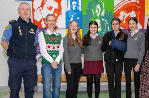 Pictured at Mount St Michael Secondary School were, from left: John Monaghan, Community Garda; Ann Marie Concagh, Deputy Principal; Zoe Diskin, Rachel Eagney, Mollie Jordan and Ellen Trench, students, with teacher Laura Brogan. Picture: John Corless