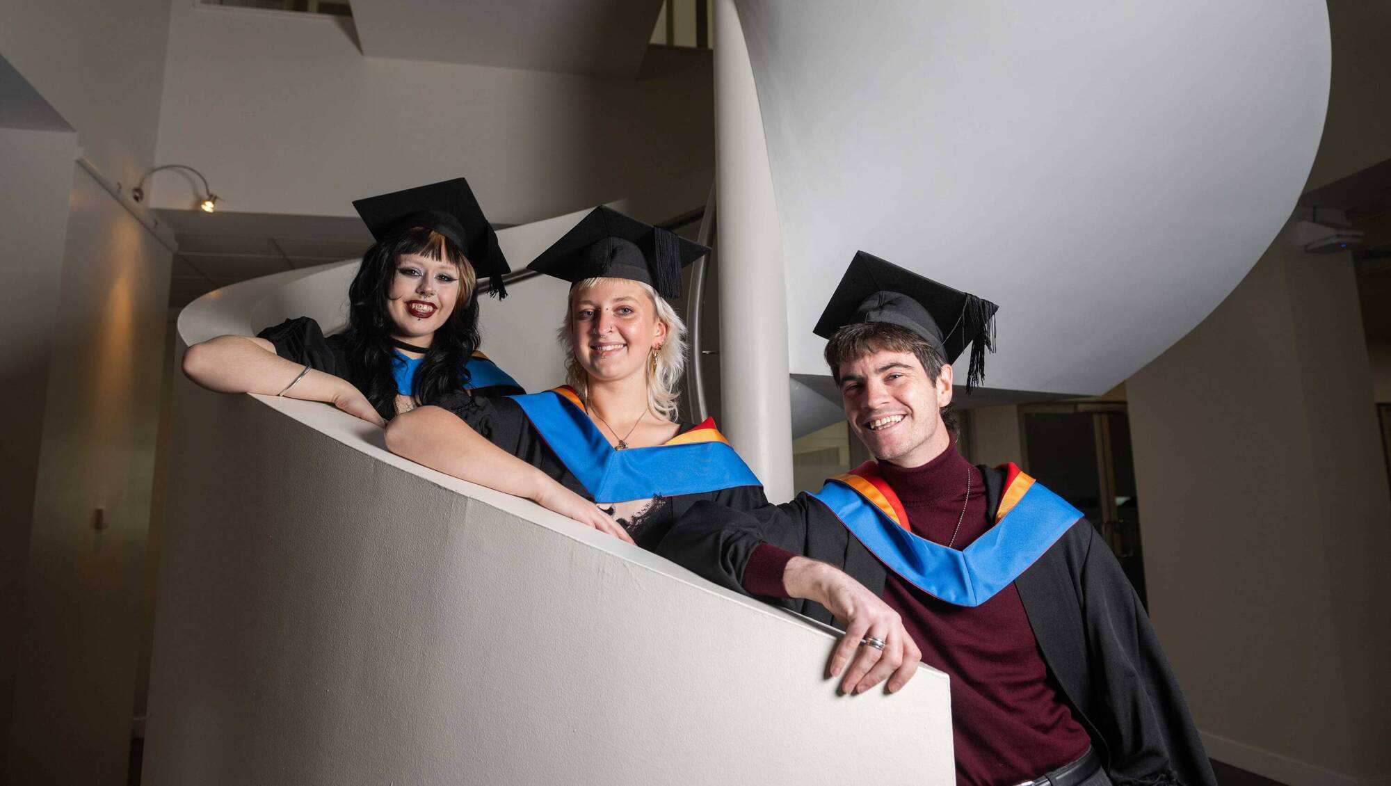 Willow Esteve (Claremorris, Co. Mayo), Tara Johnson Moore (Connemara, Co. Galway) and Fiona Cogan (Co. Kildare), who graduated with a Bachelor of Arts (Honours) in Popular Music, at the Munster Technological University (MTU) Autumn 2025 Conferring Ceremony, held at the MTU Cork School of Music on 23 October 2025.