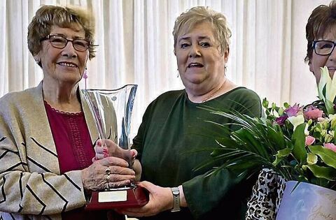 Mary is pictured accepting a presentation from Bridie Rafter and Betty Deane.