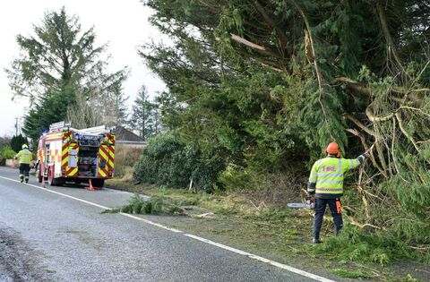 Members of Kiltimagh Fire Brigade clearing a road outside the town on the day after Storm Éowyn. Picture: John Corless