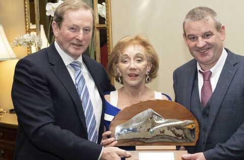 Darren Forde receiving the Mayo Person of the Year Award in 2023 from Iar Taoiseach Enda Kenny and Dr Mona McGarry of the Mayo Association in Dublin.