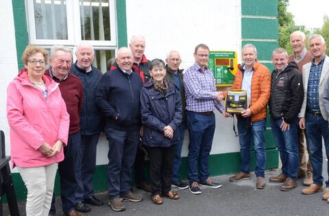 Locals pictured outside the Community Centre in Islandeady at the presentation of the new defibrillator by Cllr Ger Deere to Liam Keaveney, Chairperson, Islandeady Community Council. Also included are Darren Forde, ECO Powered Cabinets (supplier of the defibrillator) and Cllr Martin McLoughlin. Picture: John Mylette