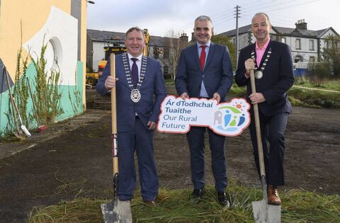 At the sod-turning ceremony for the convent redevelopment project in Westport were, from left: Cathaoirleach of Mayo County Council Cllr Sean Carey, Minister Dara Calleary TD and Cathaoirleach of the Westport-Belmullet Municipal District Cllr Peter Flynn. Picture: Michael McLaughlin