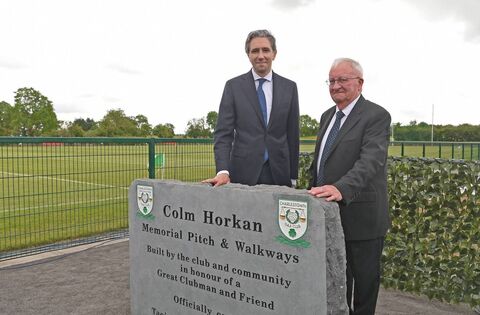 Taoiseach Simon Harris was in Charlestown yesterday to officially open the Colm Horkan Memorial Pitch and Community Walkway at the grounds of Charlestown Sarsfields GAA club.
