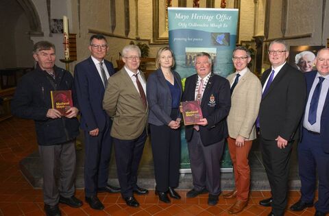 Pictured at launch of 'Medieval Mayo - Churches and Abbeys' in Ballintubber Abbey were, from left: Cllr Al McDonnell; Kevin Kelly, Chief Executive, Mayo County Council; Prof Tadhg O’Keeffe; Deirdre Cunningham, Mayo Heritage Officer; Cllr Michael Loftus, Cathaoirleach, Mayo County Council; Ronan Harbison, John Harbison and Tom Gilligan, Director of Service, Mayo County Council.
