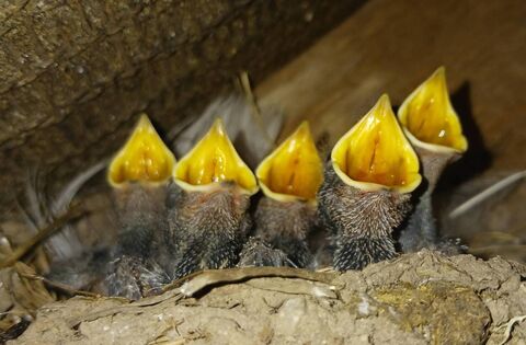 The five baby swallows in the accompanying photograph were hatched in a nest in the old Brennan family homestead in Dromada-Duke village in Killasser parish in East Mayo in a nest used every year for the past decade, rejuvenated by the swallows each year with skill and dedication. It is one of two nests in the same cottage, where up to eighteen chicks are hatched every year, and it is a magnificent sight to behold.