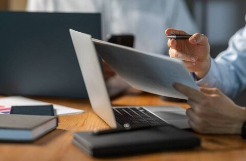 Businessman reviewing documents and working on a laptop during an office meeting, showcasing professionalism and fostering collaboration among team members in a corporate environment