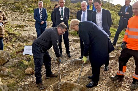 Heather Humphries Minister of Rural and Community Development helping to turn the last pathway stone with Matt McConway and David Dolan at the official opening of the pathway of Croagh Patrick as part of the Sustainable Access & Habitat Restoration that took place at Croagh Patrick Co. Mayo Photo Conor McKeown