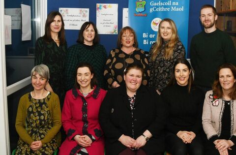 Attending the 25th-anniversary celebrations at Gaelscoil na gCeithre Maol were, back row, from left: Eileen Ní Mhuíneacháin, Nóirín Bhreathnach, Julie Robertson-Smythe, Sinéad Ní Dhurcáin agus Liam Mac Congáil. Front row: Arlene Bhreathnach, Cláir Ní Lacáin, Frances Ní Bhriain, Niamh Ní Neachtain and Aoife Clotworthy.