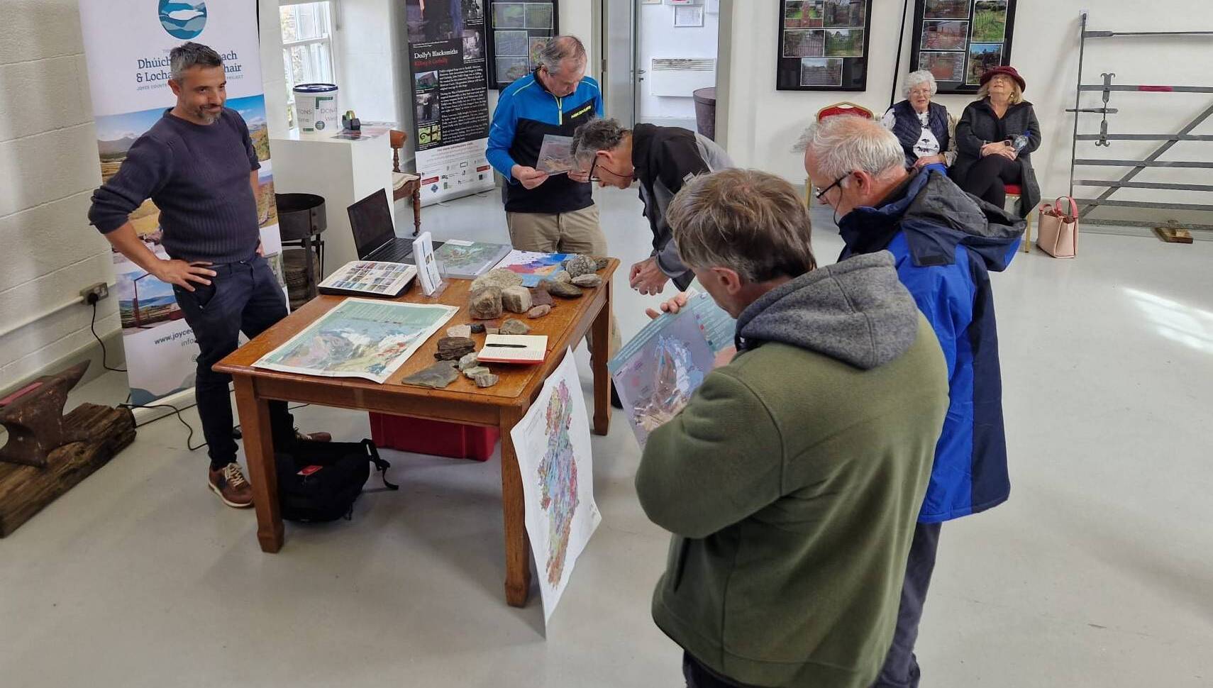 Geologist Ben Thébaudeau (left) with callers to the Joyce Country and Western Lakes Geopark road show.