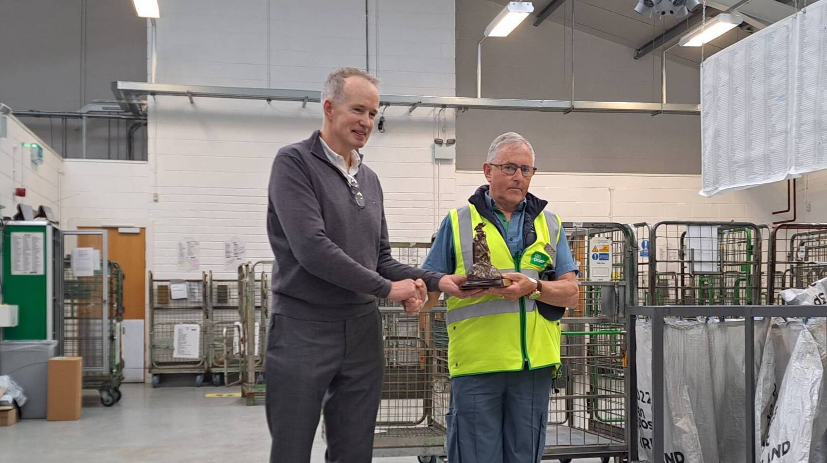 Ger Dawson, manager of Westport DSU, presents Sean McGing the Cuchulainn Statue for his 44 years service to An Post.