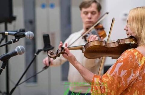 Olena Nimchuk playing music with her son Anatoliy.