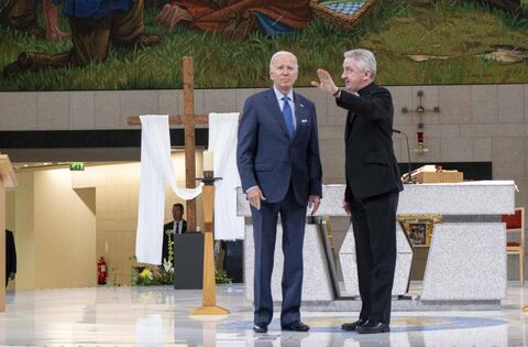 US President Joe Biden is pictured with Fr Richard Gibbons during his historic visit to Knock Shrine last year.