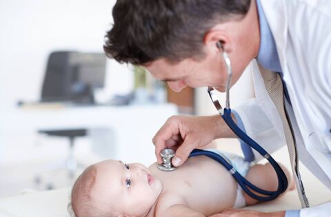 Delighted baby girl smiles at her pediatrician as he examines her chest with a stethoscope