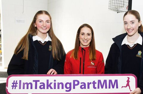 Nora Newcombe, centre, with Moy Valley AC members and St Mary's students Clodagh Gill and Aoife Blewitt at last Friday's Mini Marathon launch. Picture: John O'Grady