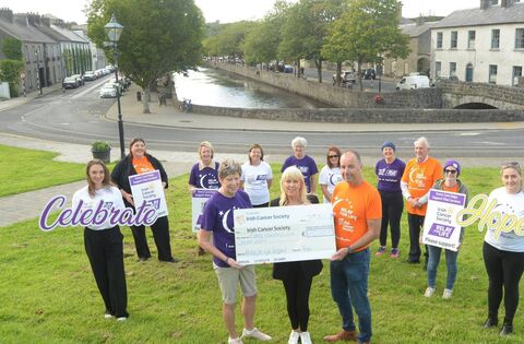 Peter Flynn, chairman of Westport Relay for Life, and Pauline Golden with members of the committee and team captains at The Fairgreen presenting a cheque for €80,007 to Mary Murray, from the Irish Cancer Society. Picture: Frank Dolan
