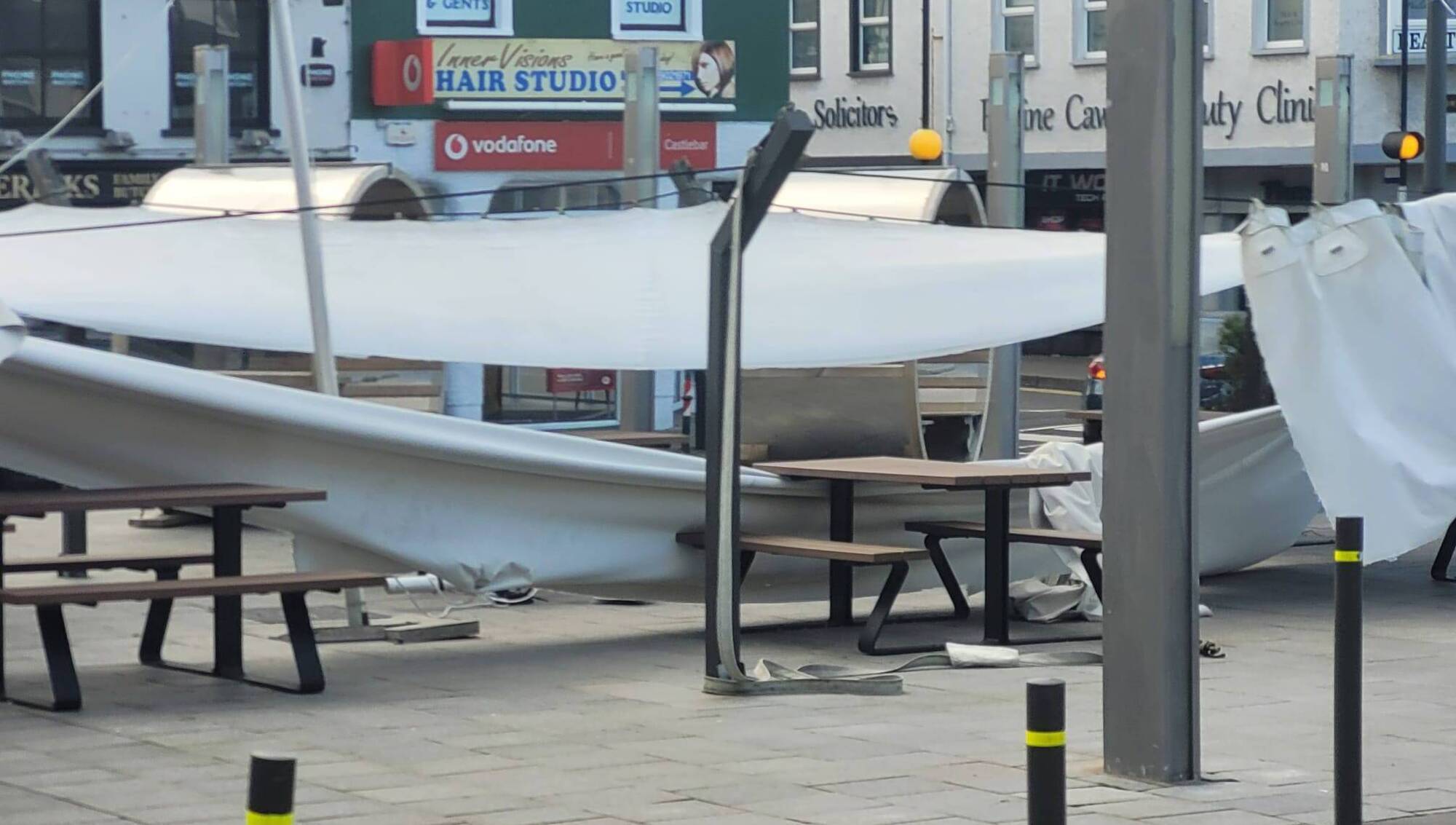 The roof of an outdoor seating area at Market Square, Castlebar, was floored by the storm.