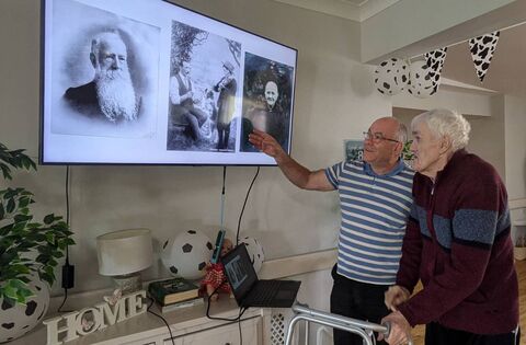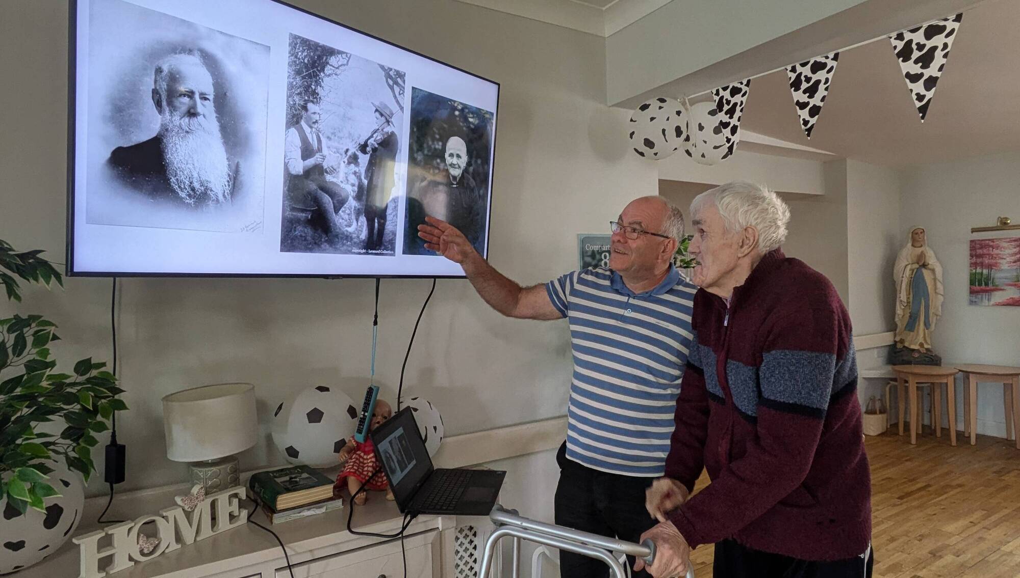 Anthony Leonard shows some of the remarkable photographs from the Leonard Collection to Padraig Corrigan during the Summer Fest at the Sonas Nursing Home in Belmullet.