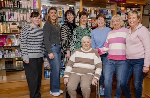 Josephine Prendergast (seated) on her retirement day at Heneghan's Pharmacy in Kiltimagh with colleagues, from left: Una O’Brien, Lilly Begley, Tamara Jordan, Sorcha O’Loughlin, Denise Byrne, Henri Grogan and Michelle Brennan.