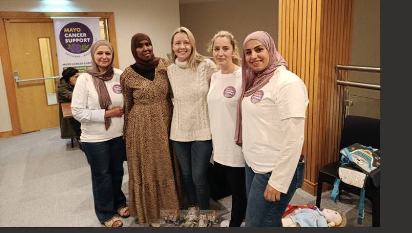 Pictured at the charity auction in the Breaffy House Resort IP Centre in Castlebar were, from left: Maha Alfrangi, Khadra Osman, Orla Gillespie (Mayo Cancer Support Association) Migena Lata and Haneen Jihad Kamal Irweishad.