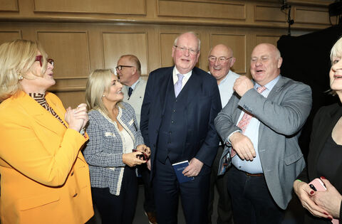 Michael McDowell with No campaigners celebrating the win at Dublin Castle for the referendum on family and care.