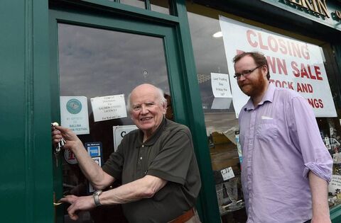 John Walkin turns the key as he closes the door of his premises in Market Square for the final time to mark his retirement in 2017. Watching on is his son John Bosco. Picture: David Farrell Photography