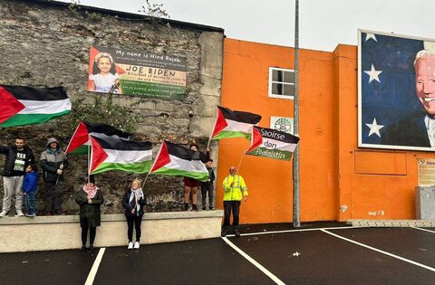 Protestors in Ballina calling for a ceasefire in Gaza wave Palestine flags under a mural of Hind Rajab at Market Square in close proximity to the mural of US President Joe Biden