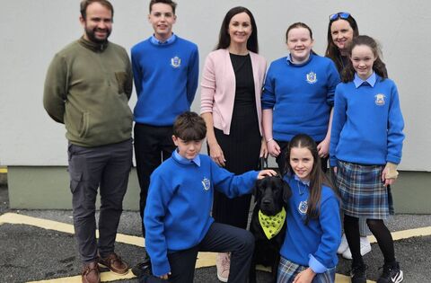 First year students at St Joseph's Secondary Schol, Foxford with Ulani, the school's new community dog, and the handlers who work with Ulani, Deputy Principal Áine McAlpine and teachers Brian Murphy and Sarah Broderick.