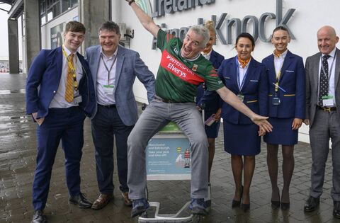 “Welcome to sunny Knock!” he declared as he descended the steps on a bleak day. He arrived wearing a Mayo jersey. After all, he is a one-man PR machine, and that became very clear as he strode around the airport.